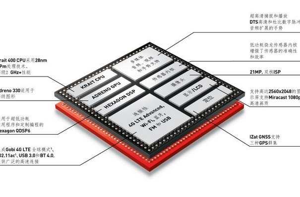 .3GHz)、(主频并不直接代表处理器的性能)升级的Adreno 330 GPU、HexagonQDSP6 V5DSP以及最新的4G LTE Cat 4调制解调器,可提供更高的系统性能和平台升级,从而进一步提升用户体验。安兔兔跑分大约在三万左右。另外骁龙800的升级版骁龙801。骁龙801处理器是美国高通公司于2014年2月24日发布的骁龙系列移动处理器中的高端产品,主要针对高端智能手机、平板电脑、智能电视等设备。小米四就是用的这个处理器。