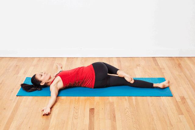仰卧在瑜伽垫上,双臂展开维持平衡。