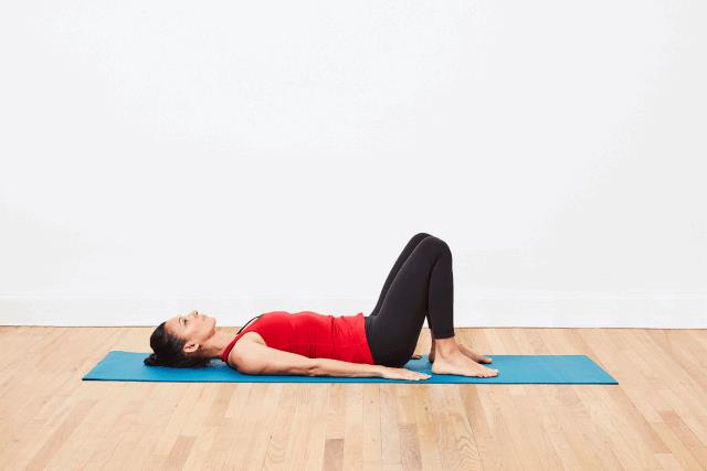 仰卧在瑜伽垫上,小腿抬起,支撑身体。