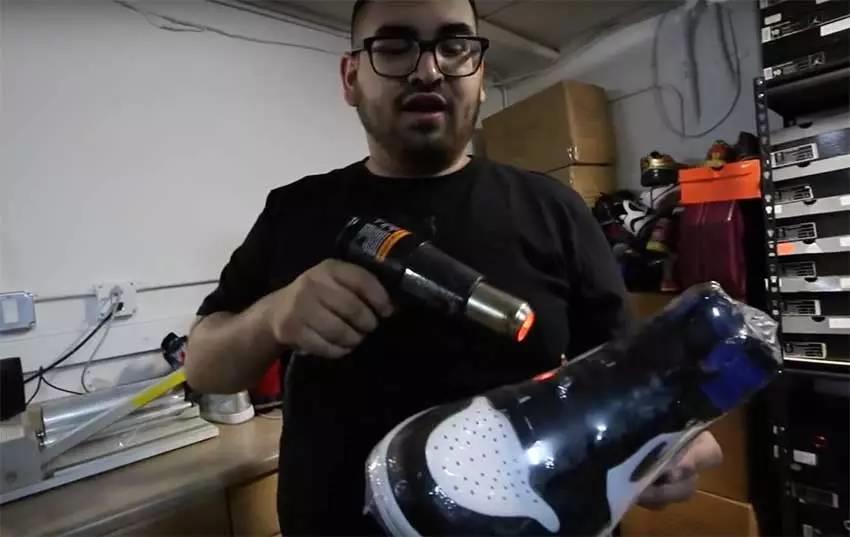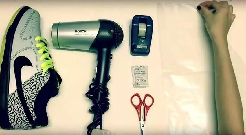 首先我们需要吹风机、热塑膜和干燥剂,其实原理类似与我们在超市见到的6盒装牛奶外面的塑料封。先把干燥剂放入鞋内,然后在鞋面上包裹一层热塑膜,用手整理出大致形状,然后用吹风机慢慢的让它受热变形,适应球鞋的形状,