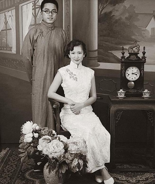 民国时接受过西方教育的夫妻,服饰是中西方结合,并且家庭条件不错。男方穿的是传统的长袍马褂,女方穿的则是西方的礼服。