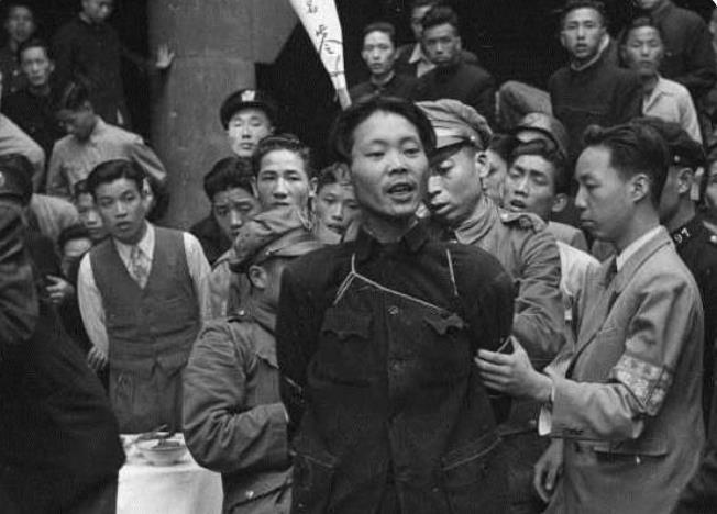 民国时期即将被决绝的一名犯人。他被一群便衣警察押解着,从他的穿着来看,应该不是普通的刑事犯罪,似乎是一名政治犯,一个革命者。