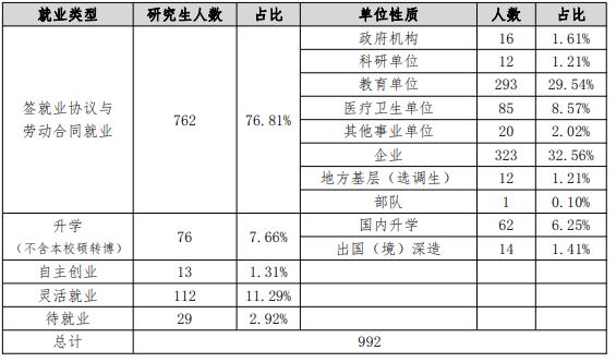 2022 届研究生毕业生共 992 人,已落实毕业去向963 人,落实率 97.08%。其中签就业协议与劳动合同形式就业人数最多,为762人,占比 76.81%。