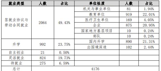 2022 届本科毕业生共 4176 人,已落实毕业去向3901 人,落实率 93.41%。其中签就业协议与劳动合同形式就业人数最多,为2064人,占比 49.43%;升学(含出国境深造)人数次之,为992 人,占比 23.75%。灵活就业 824 人,占比 19.73%;自主创业21 人,占比0.50%。