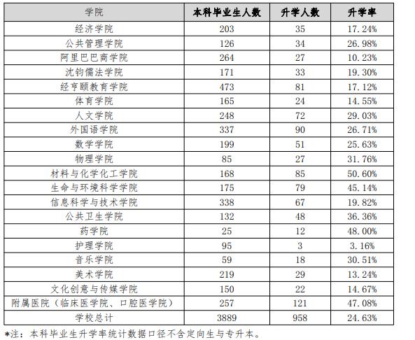 本科生各学院、专业升学率:本科毕业生中,升学率最高的学院是材料与化学化工学院50.60%,其次分别是药学院 48%、附属医院(临床医学院、口腔医学院)47.08%、生命与环境科学学院 45.14%、公共卫生学院36.36%。