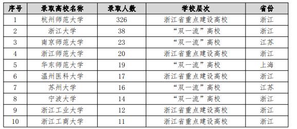 全日制硕士研究生升学流向:2022 年全日制硕士研究生国内升学69 人(含本校硕转博8人),其中进入浙江大学深造人数最多共 9 人,其次是杭州师范大学、北京师范大学、华东理工大学、华东师范大学。出国(境)深造共14人,录取高校分布在德国、法国、日本、韩国等6 个国家和地区。