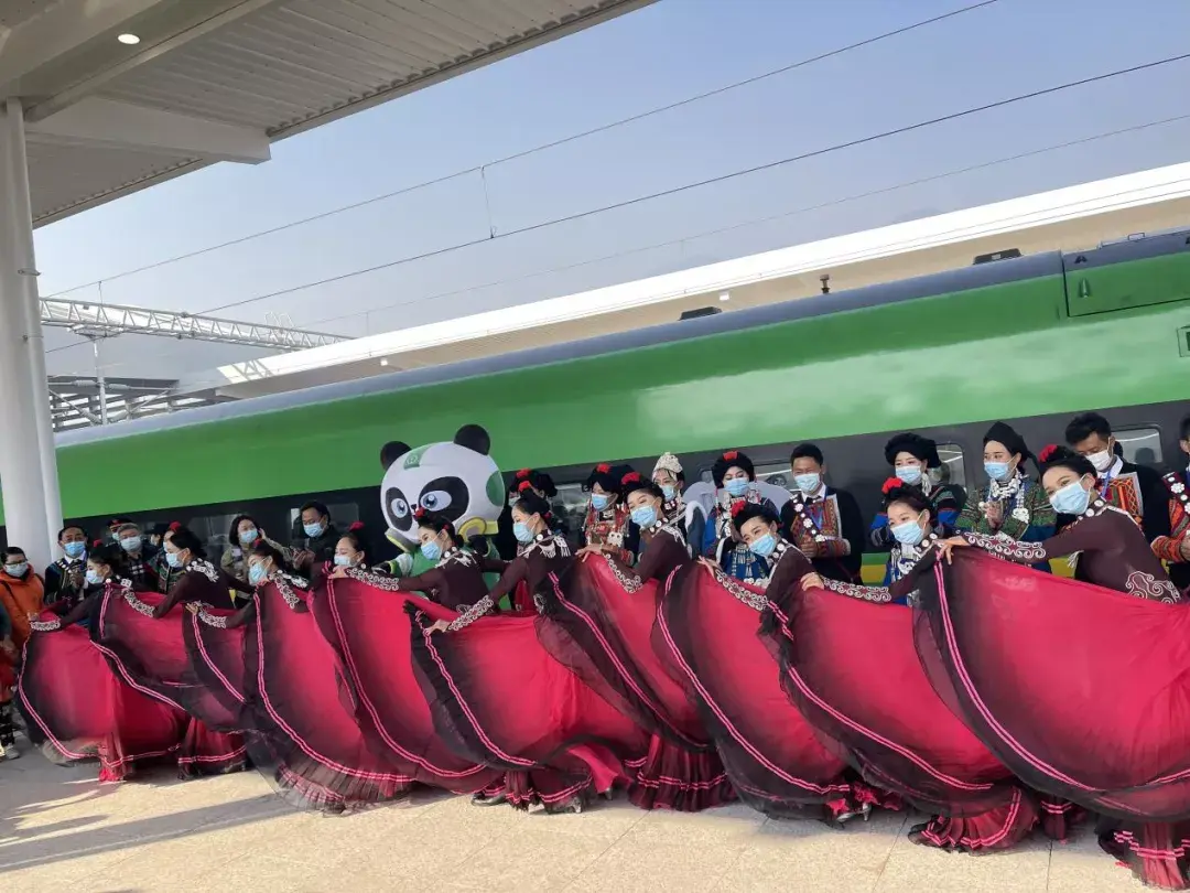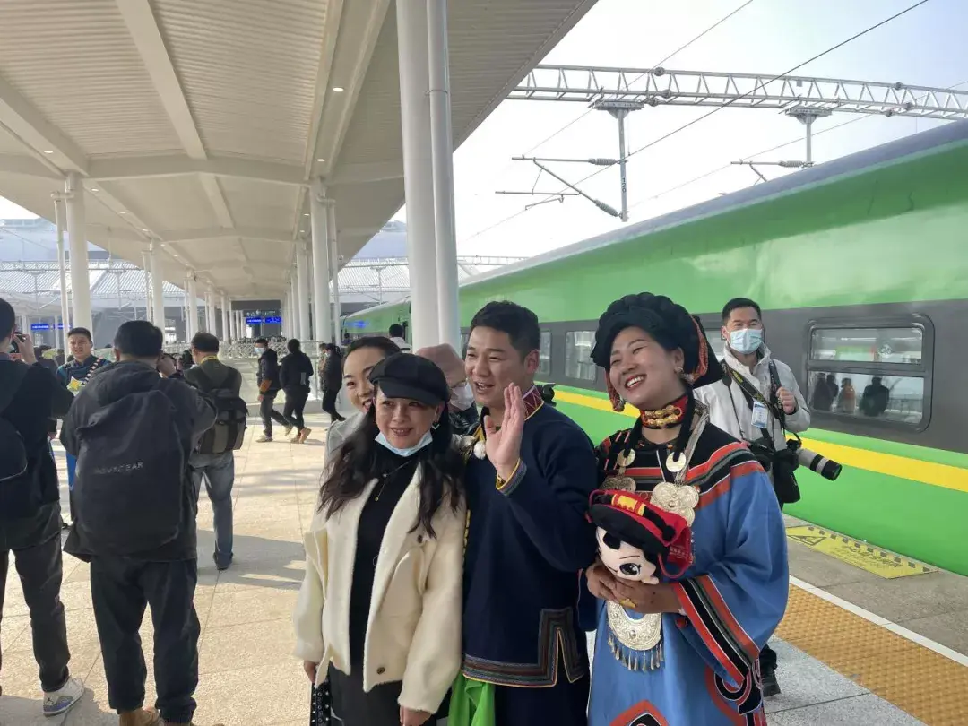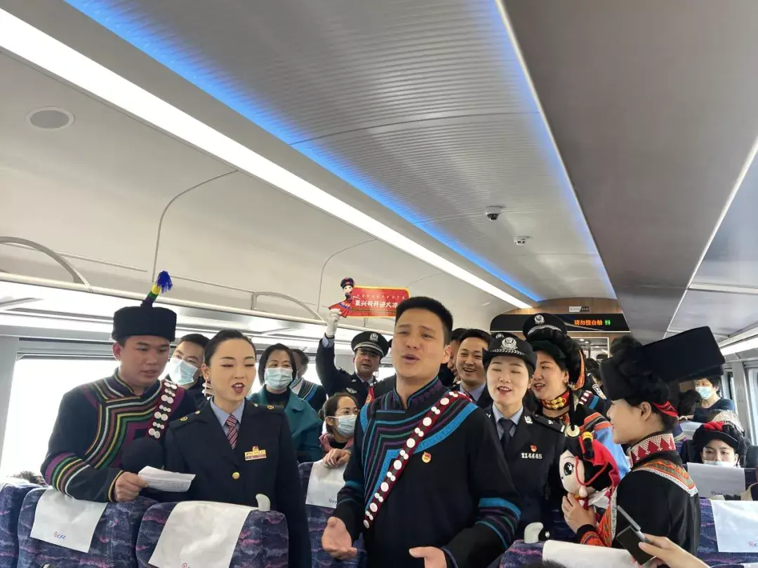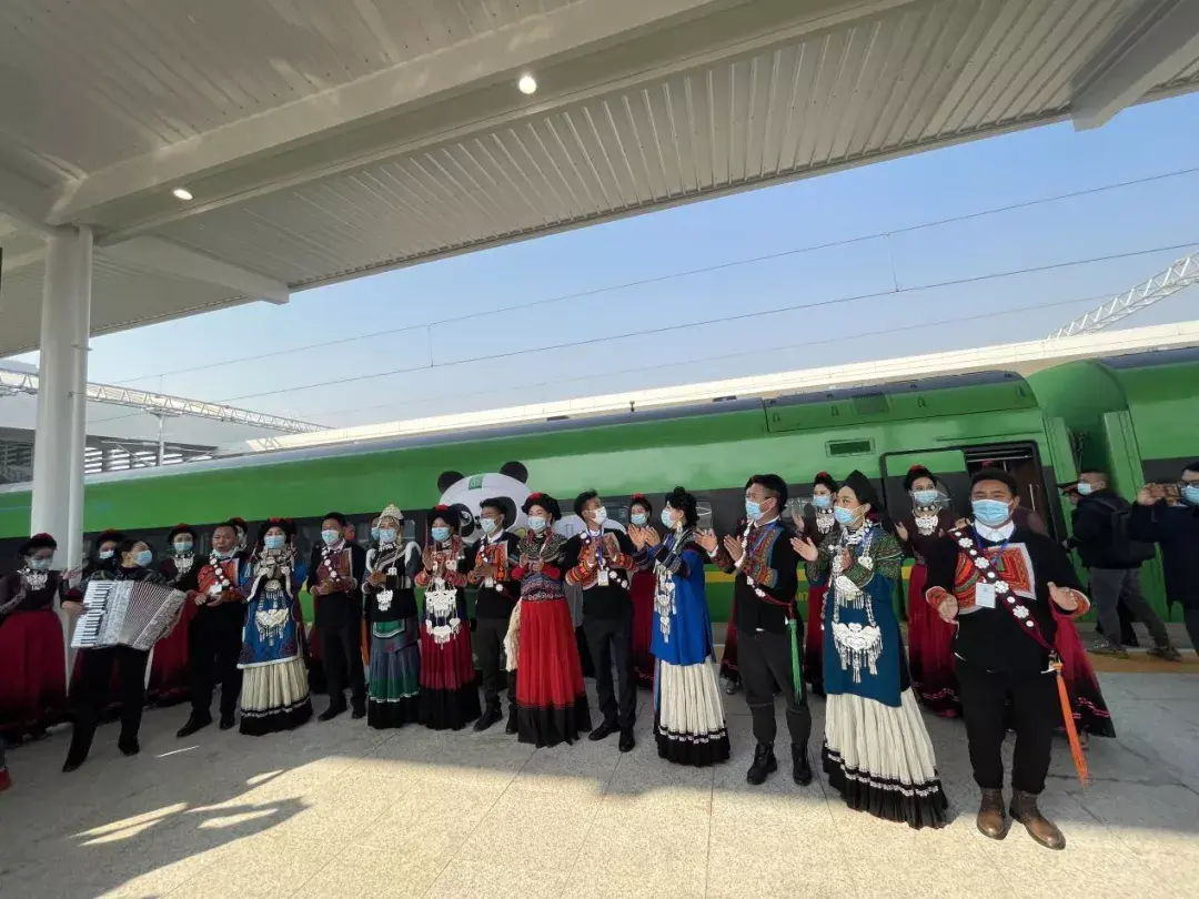 凉山州歌舞团演出人员亦是身着盛装而来,在阵阵掌声中给乘客带来不一样的旅行体验。