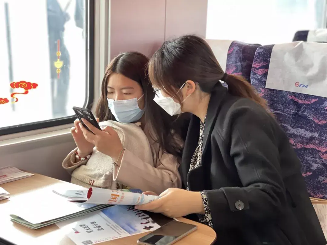 11点10分,动车正式发车,带着我们一路南行。随着动车启动,列车联欢活动在大合唱《我和我的祖国》中拉开序幕,听着澎湃昂扬的歌声,感受着城市发展的速度,此情此景,令人动容。