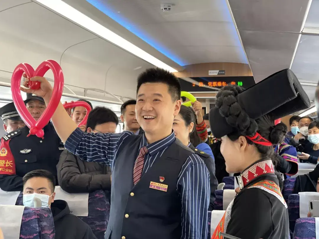 身穿民族服装的列车员带来了《我和我的祖国》《祝酒歌》《微笑操》等精彩的节目,展现了首批乘务人员的风采。