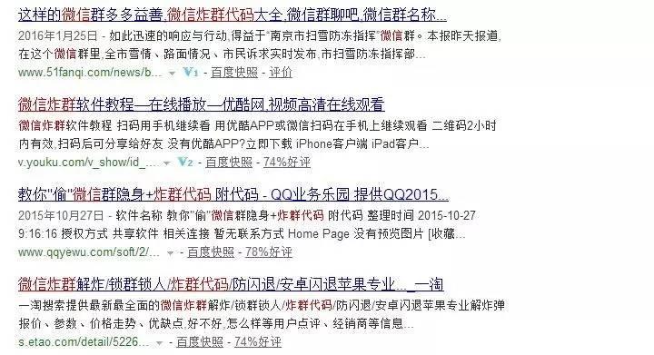 在网络上搜索“炸群”就会出现诸如“微信炸群软件”“微信炸群代码”“微信炸群大全”“微信炸群教程”等结果,在一些论坛中,还有网友留下联系方式兜售,并称可以试用。另外,百度贴吧中还出现了多个“炸群”吧,有人在贴吧中公开兜售炸群代码等。