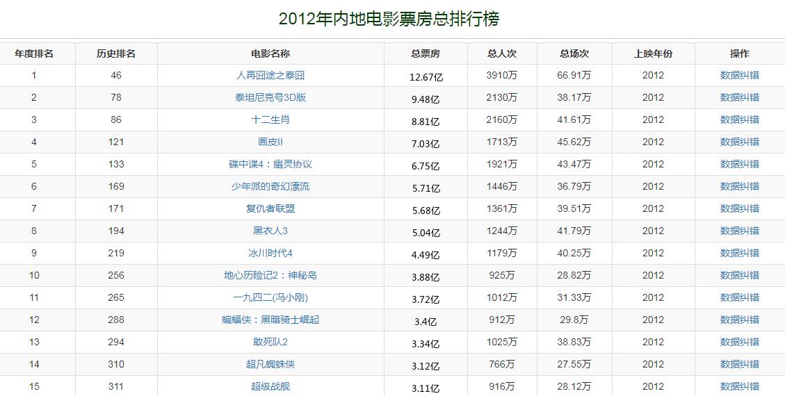 2012年,中国内地电影市场总票房收入是170.7亿。徐峥首次自编、自导、自演,并联合王宝强,黄渤共同主演的喜剧电影《人再囧途之泰囧》以12.67亿夺得票房冠军,这也是首部破10票房的国产电影。