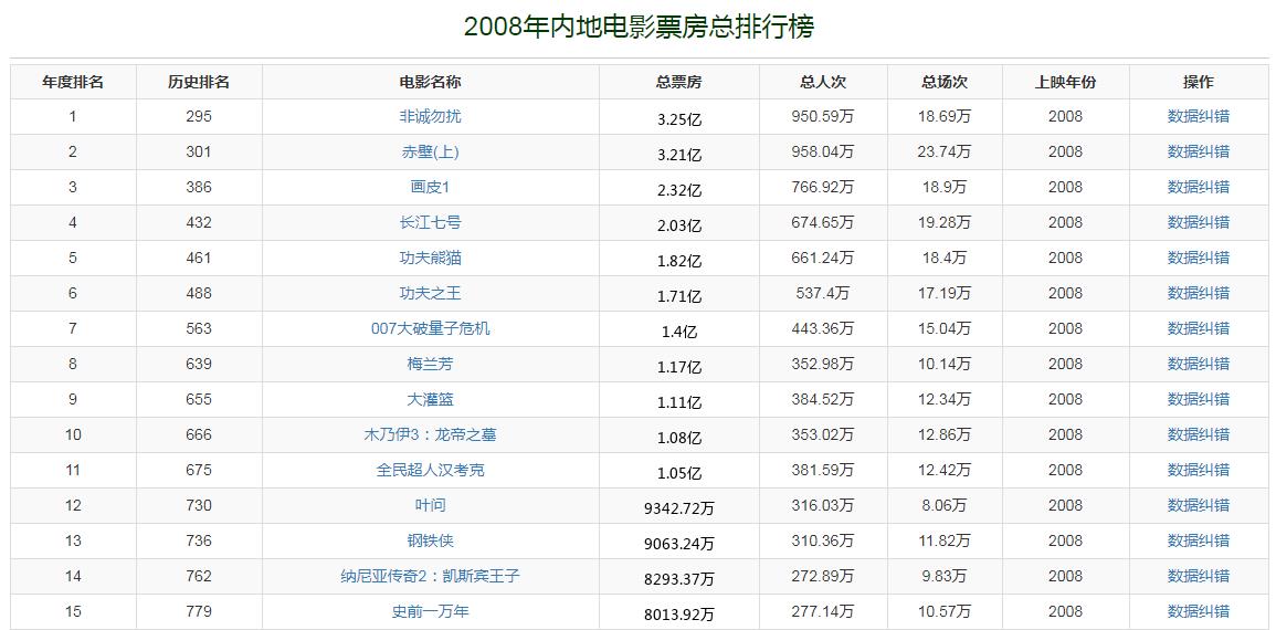 2008年,中国内地电影市场总票房收入是43亿。由冯小刚执导,葛优、舒淇、范伟、胡可等人主演的爱情片《非诚勿扰》夺得票房冠军,票房收入是3.25亿。