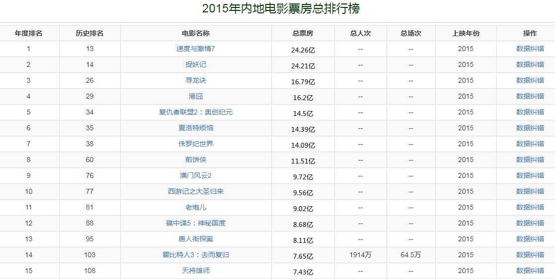 2015年,中国内地电影市场总票房收入是440.7亿。《速度与激情7》以24.26亿夺得票房冠军,该片成为首部内地电影市场票房破20亿的影片同时也成为新的票房纪录的保持者。注水的《捉妖记》以24.21亿排第二。
