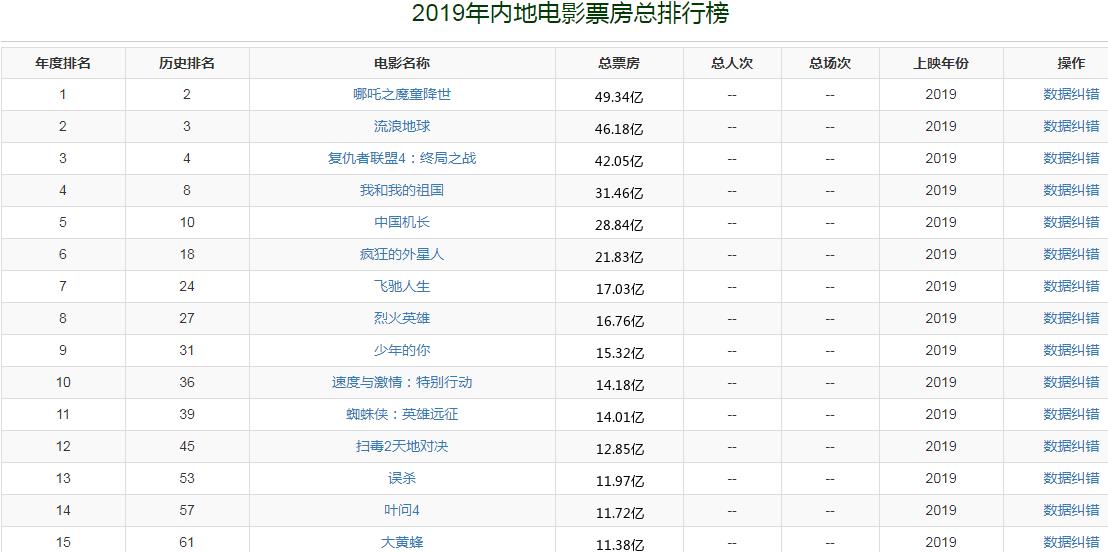 2019年,中国内地电影市场总票房收入是642.66亿。国产动画片《哪吒之魔童降世》经过长达半年的苦苦支撑最后以破50亿的票房获得冠军。