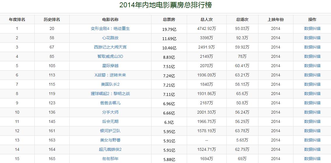 2014年,中国内地电影市场总票房收入是296.4亿,《变形金刚4》以19.79亿夺得票房冠军,该片也击败《阿凡达》成为新的内地电影市场票房纪录的保持者。