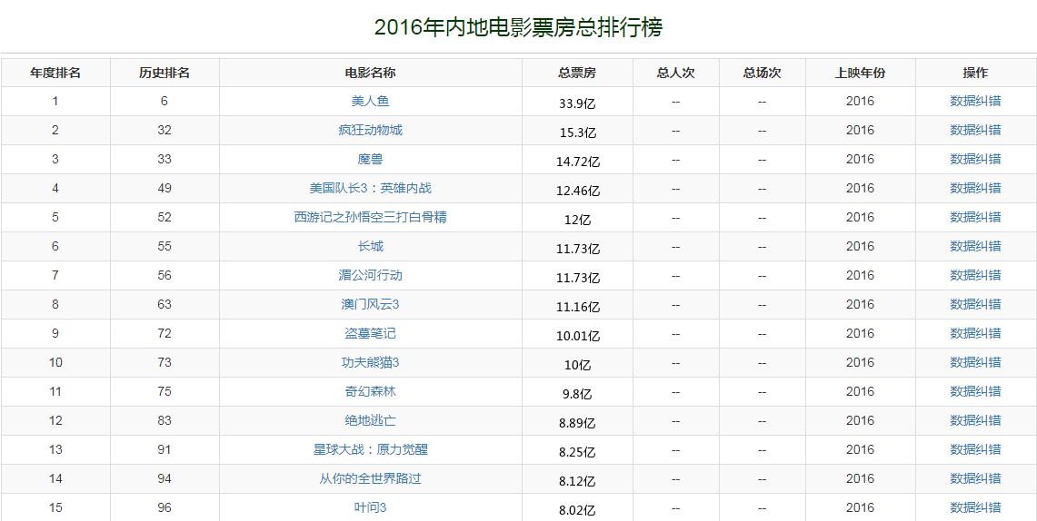 2016年,中国内地电影市场总票房收入是457亿。周星驰执导的《美人鱼》以33.9亿成为年度票房冠军,该片不但是首部破30亿票房的影片,同时也是自1994年中国院线市场化改制后,成为首部内地电影市场历史票房冠军纪录保持者的国产片。