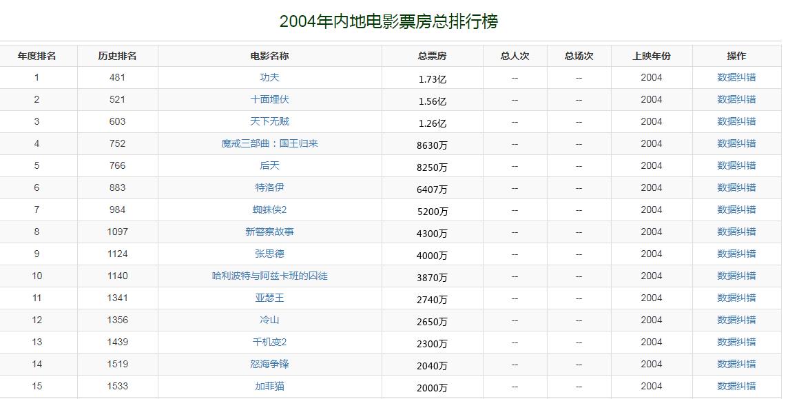 2004年,中国内地电影市场总票房收入是15亿。周星驰电影《功夫》以1.73亿夺得票房冠军。