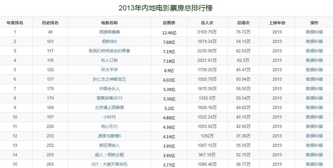 2013年,中国内地电影市场总票房收入是217.7亿。票房冠军是周星驰执导的《西游降魔篇》,票房收入是12.46亿。