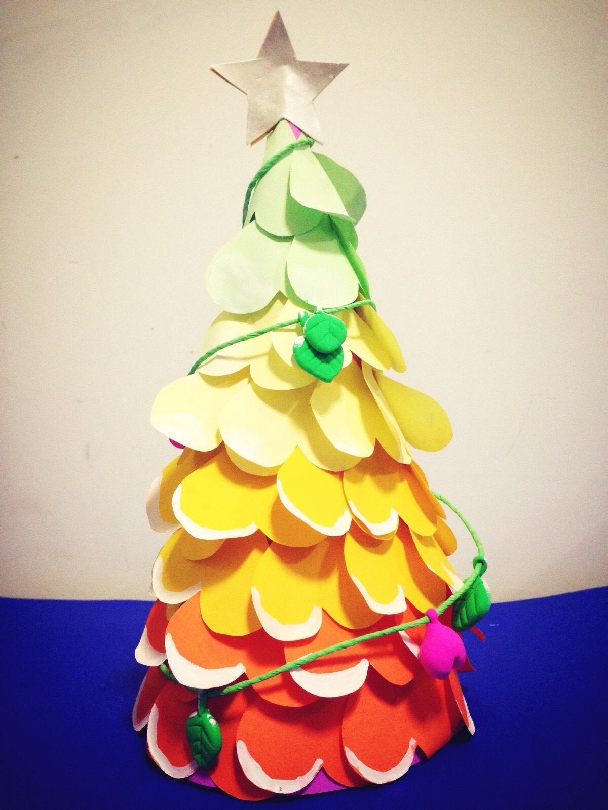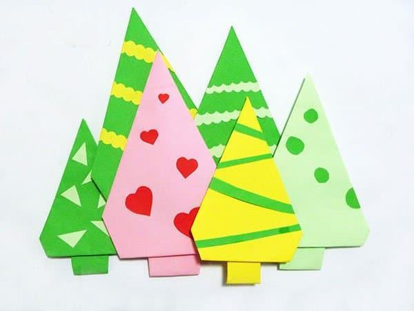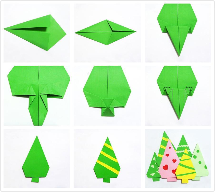 制作步骤 1.首先按照上图折出树冠部分。 2.用材质剪出彩条或者小爱心等装饰。 3.把剪好的装饰物粘在树冠上即可。