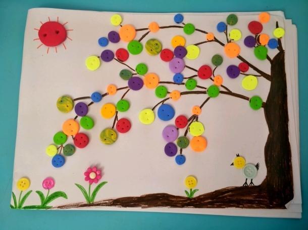 纽扣的样式多颜色也多做出来的大树深受孩子喜欢。但是要注意,做纽扣树必须在家长指导下完成。