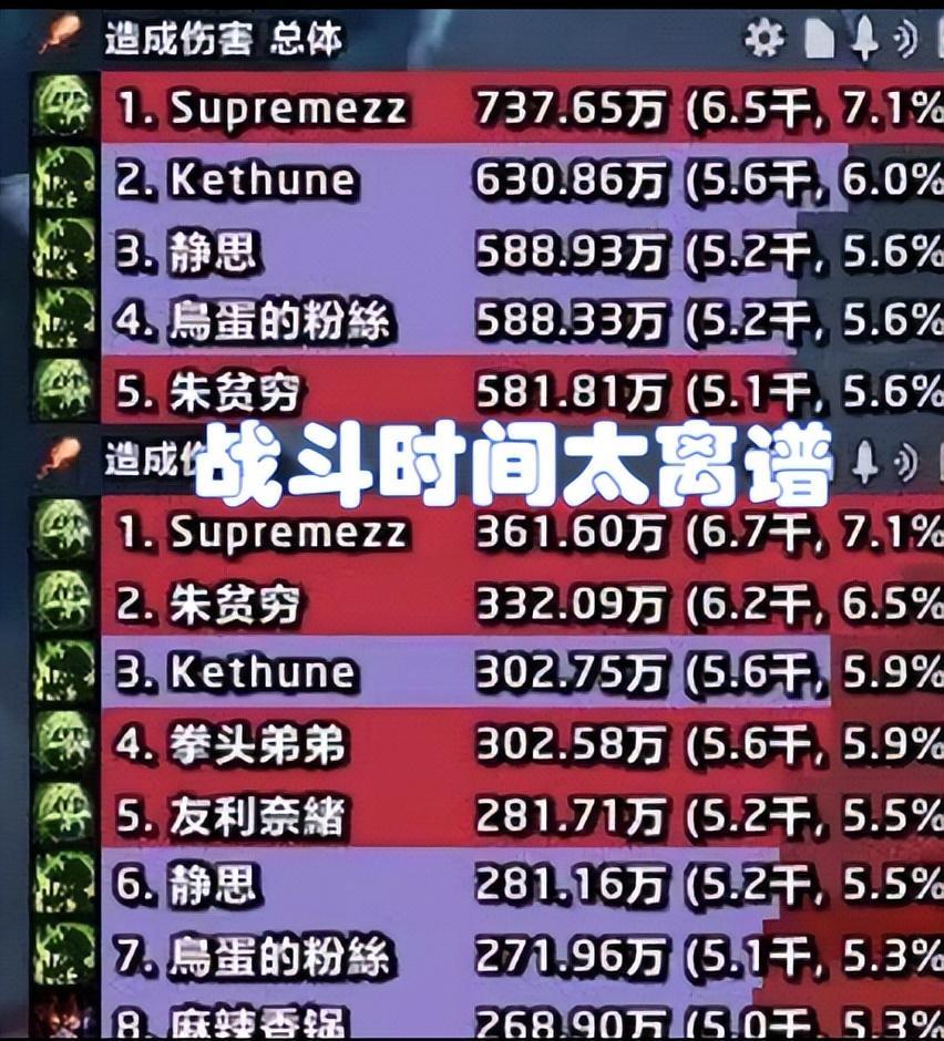 大家不要觉得6500点很低,小探算了一下他们这场战斗的总时间为7376/6.5=1134秒,也就是18分钟,一场BOSS战打这久真是非常离谱,这么长的战斗时间,爆发药水和嗜血的效果都被拉到了最低,这些打6500秒伤的玩家放到NAXX个个都是秒伤破万的好手。