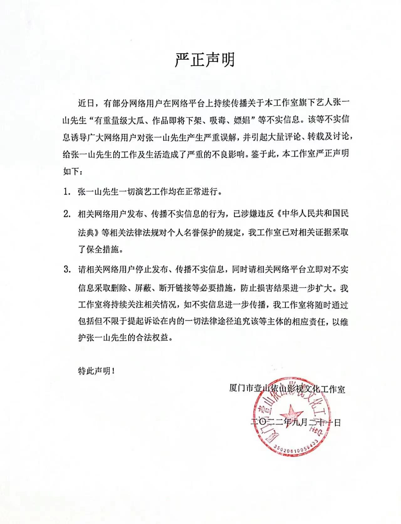 9月21日晚,张一山工作室发布声明辟谣,直言网上所传播的不实信息使网友们对张一山产生了严重误解,工作室将维护其的合法权益。