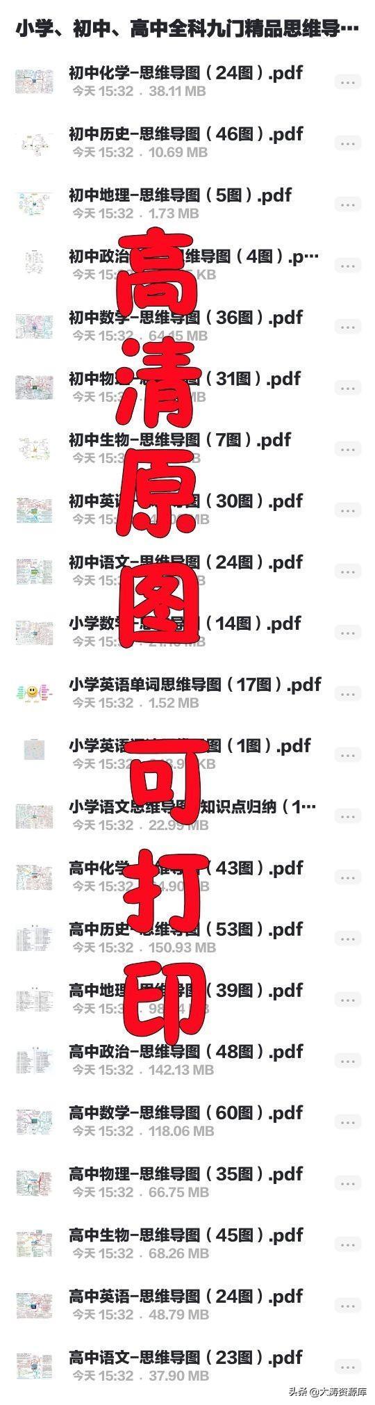 这套思维导图涵盖小学,初中,高中全9门学科,高清PDF格式,可打印出来方便学习。