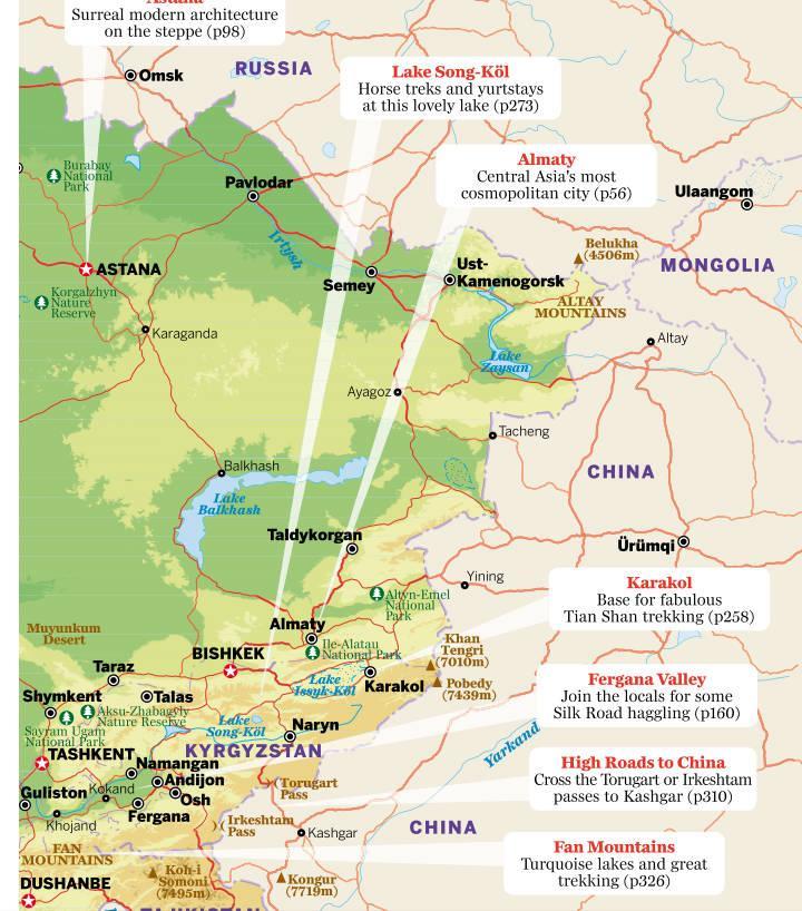 6.英文的中亚地图,介绍中亚五国的首都和交通地形图。