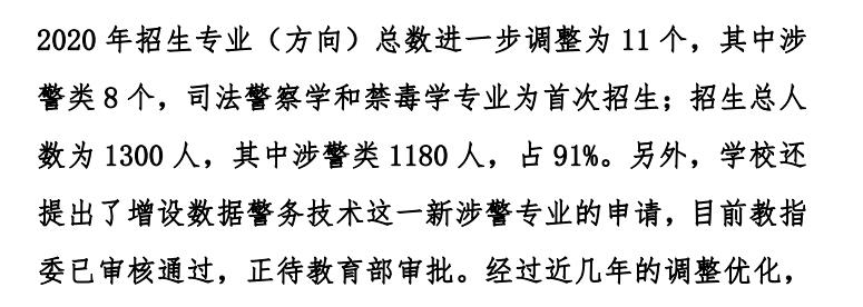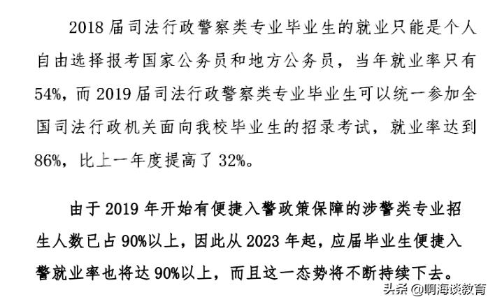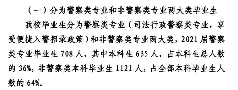 在2018年以前,司法警察考试招考是通过国考与省考的,那个时候中警院的就业率只有54%左右;2019年司法警察招考制度发生了变化,学校的司法警察类专业毕业生可以参加司法部的统一招考,竞争要小很多了,入警率上升到86%,相比2018年提升了32%。其中涉警专业招考占比为88%。
