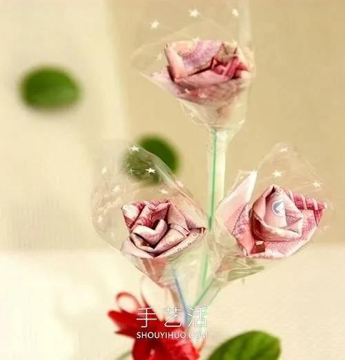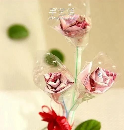 12.多做几朵,并添加丝带花,漂亮的纸币折花装饰就完成啦~