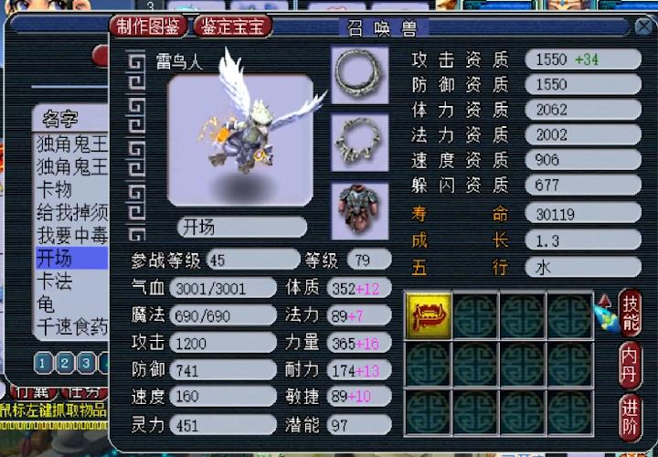 携带浮云神马技能的召唤兽,我们见过最多的就是服战童子,可以说稍微有点实力的服战土豪都会携带神马童子。而作为娱乐玩家的109或者69级玩家,给召唤兽拍浮云神马兽决简直就是奢侈。不过还是有第一个吃螃蟹的人,王谢就是其中一位,第一个给画魂拍神马兽决的玩家,并且打造了八匹马!如今另外一位69级土豪也打破了常规,给雷鸟人上浮云神马兽决,如上图所示。13技能翻页全红雷鸟人宝宝,附加了极限资质成长,攻击1584,成长1.3,同时携带了浮云神马以及壁垒击破双特殊技能,号主是一位狠人。