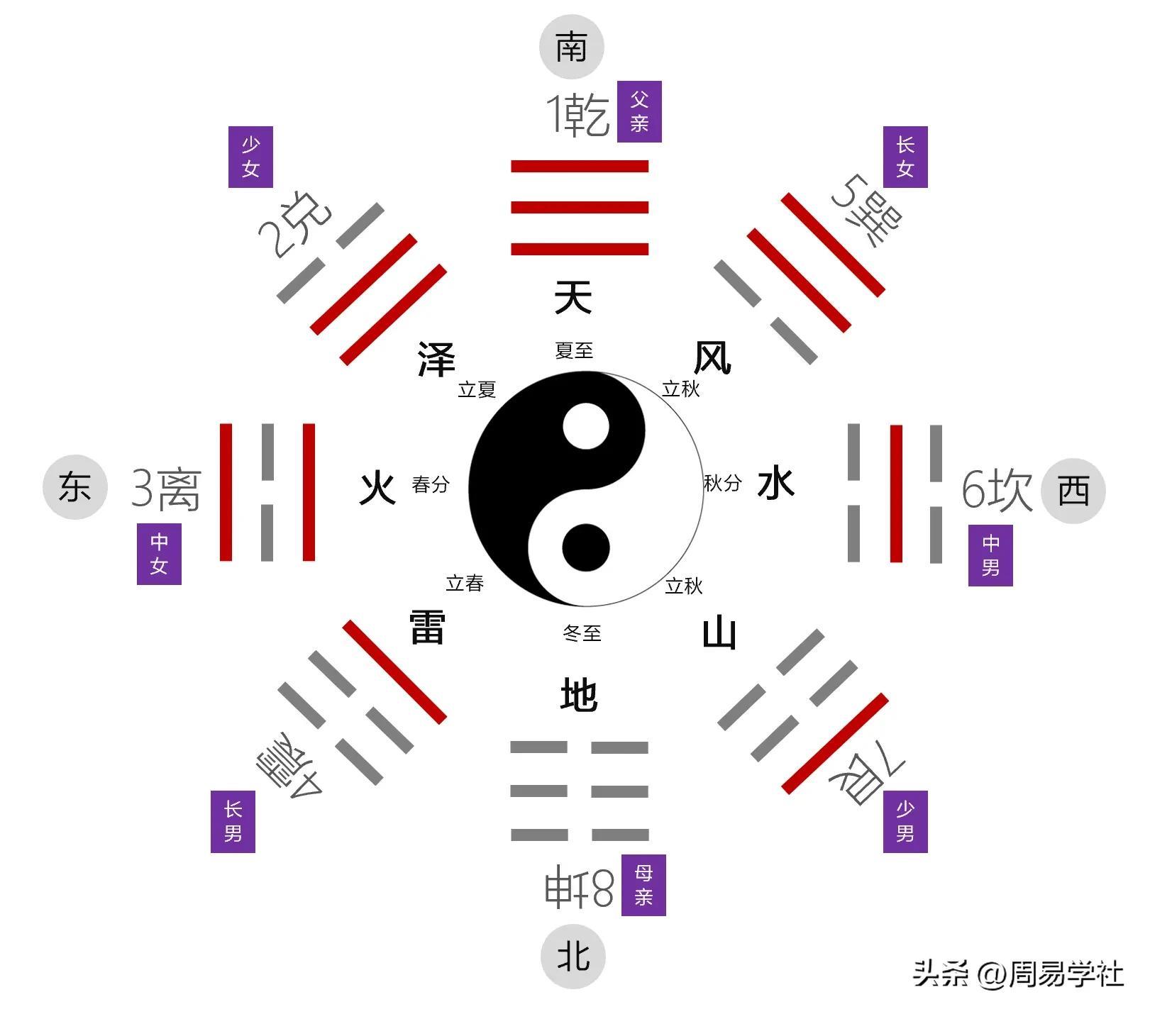 2、先天八卦的排列顺序为:乾一、兑二、离三、震四、巽五、坎六、艮七、坤八,顺时针排一圈就是一个循环。