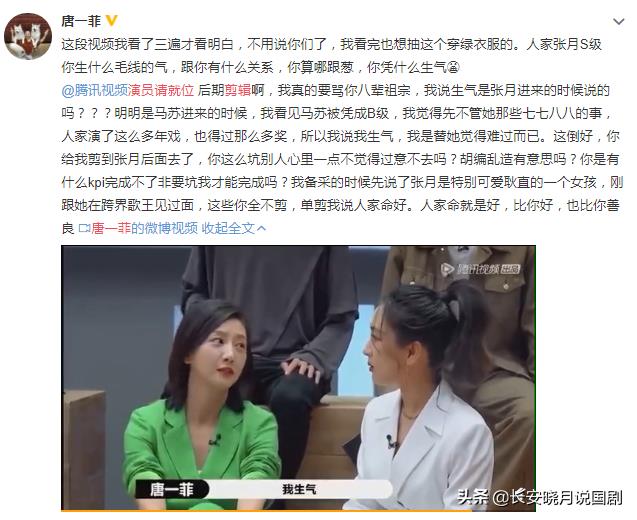 3日,唐一菲 发文怒怼《演员请就位》节目剪辑,她直言遭受恶意剪辑而被网友攻击。她表示:她生气是因为马苏被评为B级,感觉她演过那么多戏拿过那么多奖,替她觉得难过,结果节目组把她这段话剪到张月进场后了,显得像是对张月拿到S级评分而感到不满。