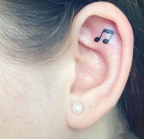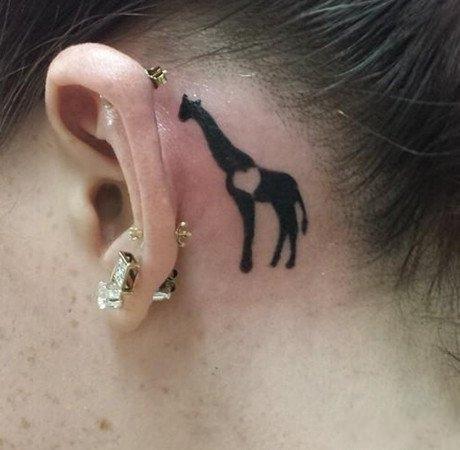 耳后这个位置小编很喜欢,其实还是挺隐蔽的,只要你将头发放下来,别人就看不到你的纹身。这个地方可以纹一些小面积的图案,像上面这款长颈鹿就非常可爱,大家注意到它特别的地方没有。在脖子下面的位置有个镂空的爱心形状,超级可爱。