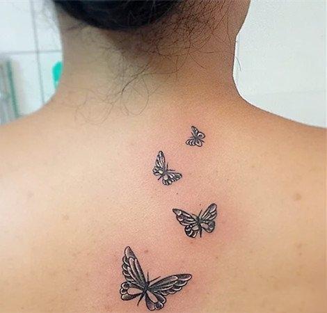 蝴蝶图案非常受女生欢迎,将它纹在后背也是不错的选择。像上面这样,蝴蝶从上往下越来越大,形成一个S的形状,非常好看。如果不喜欢全黑的颜色,也可以纹成彩色的哦!