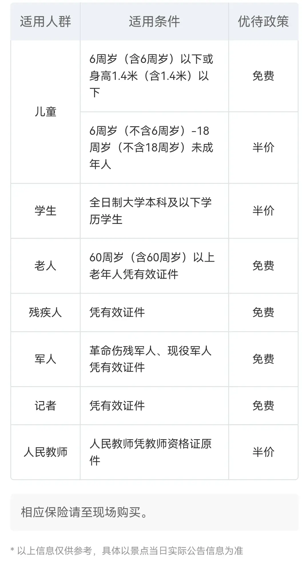 包括,儿童,60岁(含)以上老人,残疾人,军人(包括退役军人),记者等5类人。教师和学生半价。具体可以参考下方携程网截图。
