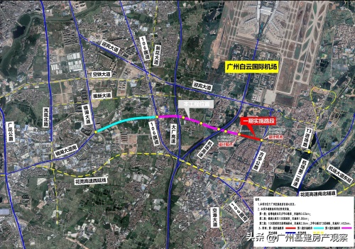 机场大道全线(镜湖大道至方华公路)定位为空港核心区内连接总部经济区、中央商务区、空港文旅小镇、白云机场枢纽等重要区域的东西向交通大动脉,将承担未来空港核心区对外联络、集散主要通道的功能。项目分三期建设,一期为东段方华公路至高增地铁站,二期为西段镜湖大道至106国道,三期为中段106国道至高增地铁站。本次实施的为一期工程。