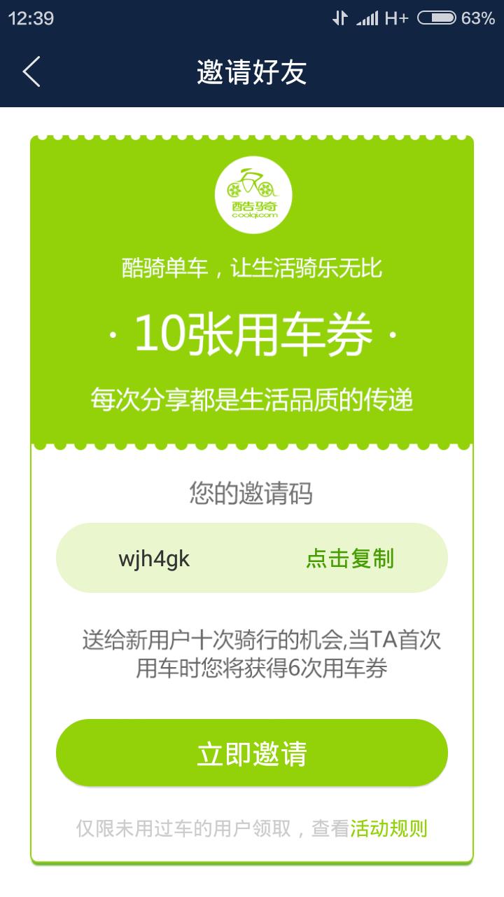 支付了29元8的用车押金(押金和充值余额是不同的)注册完成后,系统会赠送10张用车卷,邀请好友赠送6张用车卷,于是给各种好友,各种群发了酷奇的广告,还被踢出了好几个群呀,最终,估计有6个人通过我的连接注册了酷奇。