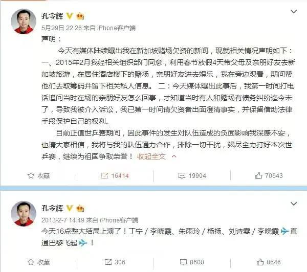 此消息一出孔令辉第一时间澄清这是他自己带亲人朋友去新加坡游玩,亲人朋友在玩,而他在旁边看,并且并不知道亲人朋友有欠款。