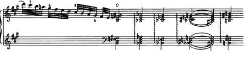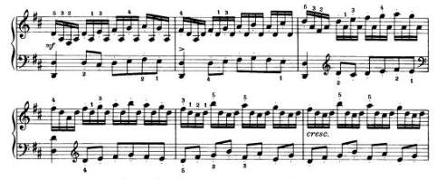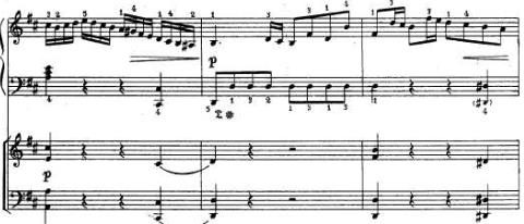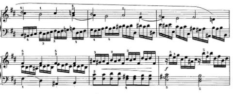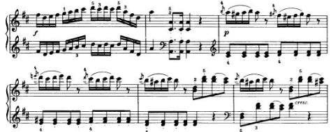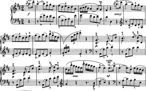 右手更加困难,它有两个层次,符杆朝上的是第一声部,符杆朝下的是第二声部,我们要突出上面的声部。