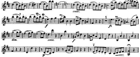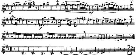 第34小节的长颤音,颤动的次数可以根据需要进行调整,但必须严格遵循拍子。接下来的旋律(第35小节)要轻柔地进入,这个地方很像两只圆号的声音,非常透明。第36小节的第二拍是一个对比点,要强烈而像铜管乐器的声音。