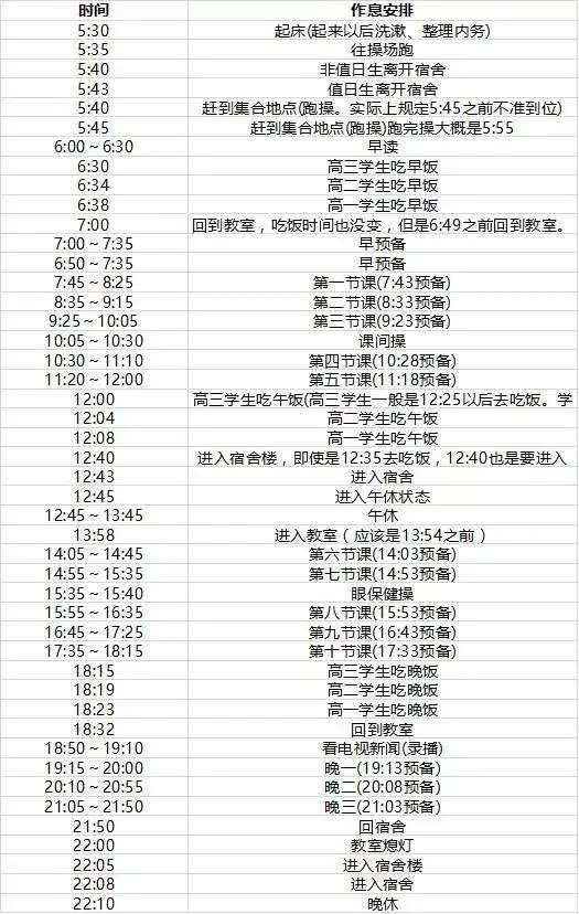 我们先来看一份衡水中学网上流传很久的作息时间表: