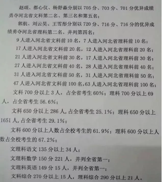 虽然衡水中学2018年没获得河北省文理科状元,但是看看河北省文科前100名衡水中学有47人,理科前100名衡水中学有63人,您就知道衡水中学在河北省超级霸主的地位,而河北省今年高分的考生全国最多,600分以上的学生超过3万人,衡水中学能取得这样的高考成绩也是很不容易的。