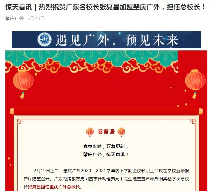 张校长今年离开了服务多年的潮阳实验,前往肇庆广外担任总校长,从学校公众号这略显“中二”的标题可以看出张校长的地位。外界也因为张校长的加盟对肇庆广外充满期待,看好这是“下一个潮实”。