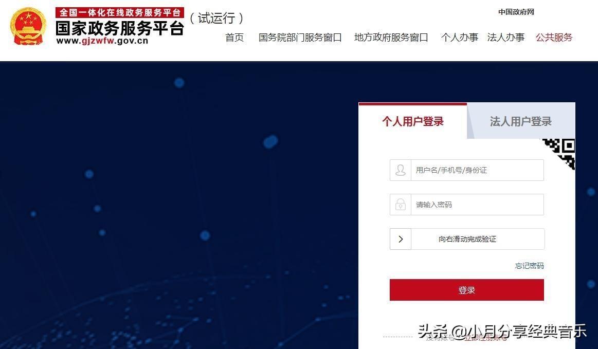 点击“个人登录”跳转至国家政务服务平台,选择“个人用户登录”,输入国家政务服务平台用户名、密码,登录(新用户凭身份证和手机号按照平台提示注册账户);