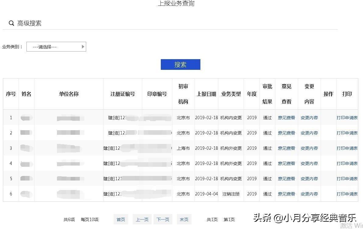 (1)可根据‘业务类型’进行搜索,查看所上报业务的审批结果、意见查看、变更内容、 删除、撤回、打印申请表操作,如下图: