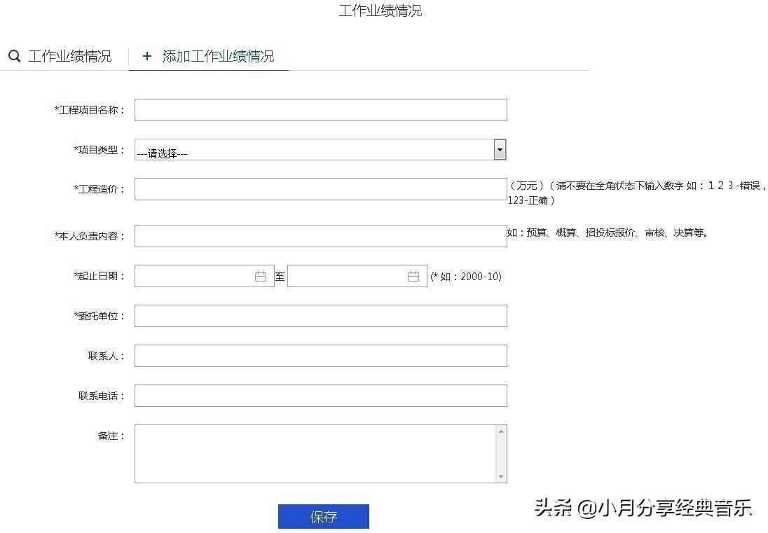 点击“添加工作业绩情况”,可填写工作业绩的相关内容,填写后点击“保存”按钮,可进