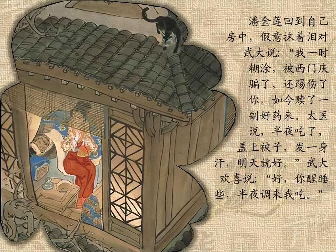 这样的反转可以说是十分的讽刺了,到故事的最后潘金莲被武松手刃,西门庆吃了过多的春药病死,其余二人都离去,只剩下西门庆的原配妻子吴月娘为西门庆收尸。全书的讽刺程度仅次于《儒林外史》,也可以说是不相上下的。这部书虽然带有极高的文学价值但是书中有非常多关于男女露骨的情节,和淫秽的描述,国家担心如果给未成年人看来会有不好的影响所以将这本书删减了。