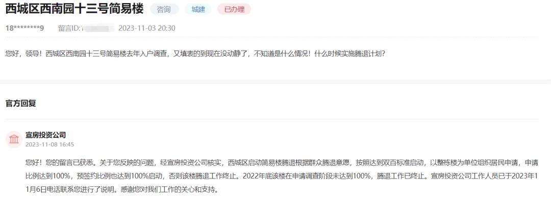 宣房投资公司回复:经宣房投资公司核实,西城区启动简易楼腾退根据群众腾退意愿,按照达到双百标准启动,以整栋楼为单位组织居民申请,申请比例达到100%,预签约比例也达到100%启动,否则该楼腾退工作终止。2022年底该楼在申请调查阶段未达到100%,腾退工作已终止。