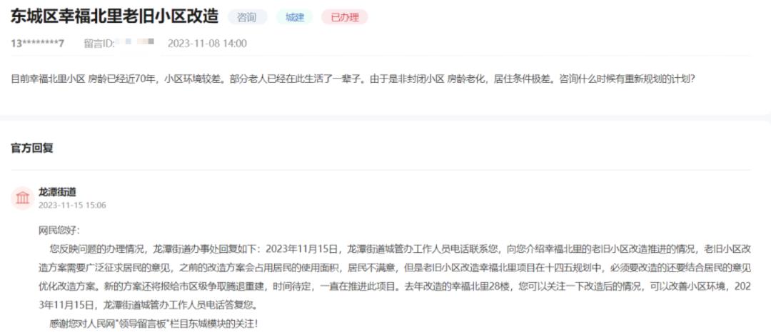 提问:目前幸福北里小区,房龄已经近70年,小区环境较差。部分老人已经在此生活了一辈子。由于是非封闭小区,房龄老化,居住条件极差。咨询什么时候有重新规划的计划?
